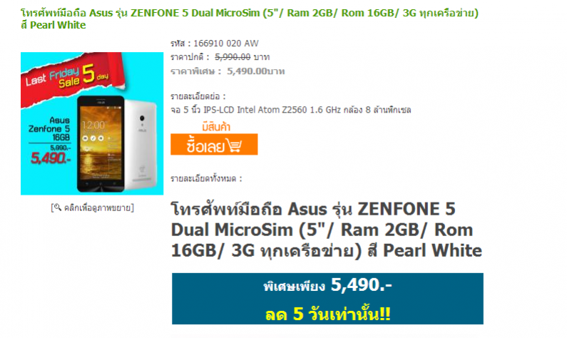 การซื้อ Asus Zenfone 5 ผ่านทางร้านค้าออนไลน์ก็เป็นอีกทางเลือกหนึ่งครับ เพราะอย่างน้อยก็การันตีได้ว่าจะมีของหรือไม่ และถ้าใครสนใจที่จะซื้อ Asus Zenfone 5 ก็ต้องบอกว่าให้ไวเลยครับ เพราะตอนนี้ Asus Zenfone 5 ที่ขายผ่าน Shopat7 ลดราคาเหลือเพียง 5,490 บาท จากราคาเต็ม 5,990 บาท ที่สำคัญคือเป็น Asus Zenfone 5 ล็อตใหม่ที่มีหน่วยความจำภายใน 16 GB ด้วย แต่จะลดราคาเพียง 5 วันเท่านั้นนะครับตั้งแต่วันที่ 29 สิงหาคม – 2 กันยายน 2557