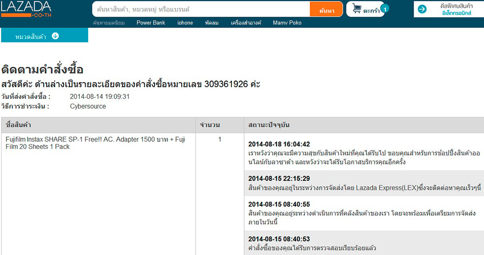 เรื่องมันมีอยู่ว่า เมื่อคืนวันที่ 14สิงหาคม ผมได้สั่งสินค้า ผ่าน lazada ครับ คือ ปริ้นเตอร์ Instax SP-1 หรือเครื่องปริ้นภาพ ฟิล์มฟูจิ instax