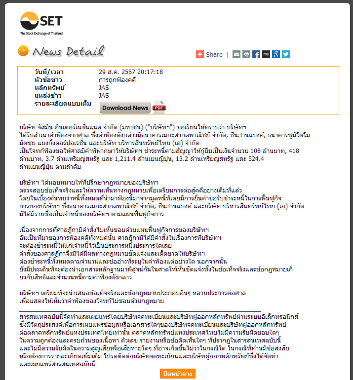 ใครมีข้อมูล หรือข่าวเกี่ยวกับการฟ้องร้องของ TT&T กับ JAS บ้าง
