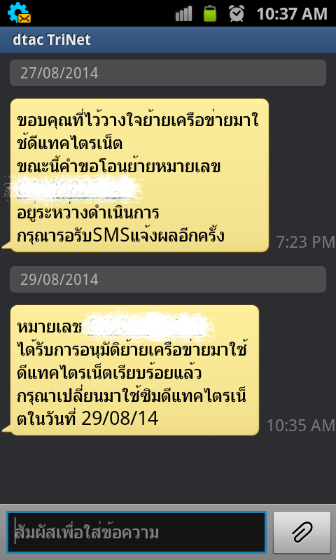 สืบเนื่องจากโปรย้ายค่าย Dtac แลกซื้อเครื่อง 6.000 บาท ผมได้ทราบข่าวโปรดังกล่าวก็เย็นวันศุกร์ที่ 22 ส.ค. 57 ตอนแรกๆก็ งง ว่าโปรนี้มีจริงหรอ ทำไมแลกซื้อ Iphone 5s / HTC M8 / HTC desire 816 ได้ถูกเว่อร์ อยากได้ HTC M8 มากกกกกก (ใช้ HTC One max อยู่ ซึ่งแต่เดิมใช้มาทั้ง Samsung Sony Oppo Iphone พอใช้ HTC แล้วชอบมากกกกเป็นสาวก HTC เลย) ถึงแม้จะติดสัญญา 1 ปี และจ่ายล่วงหน้าก็เหอะ บวก ลบ คูณ หาย แล้วยังไงก็คุ้มเว่อร์ เลยตัดสินใจโทรไปถาม call center dtac ตอนนั้น call center dtac บอกไม่มีโปรนี้ เลยมาหาข้อมูลในห้อง Pantip มีแต่คนมาตั้งกระทู้เรื่องโปรดังกล่าวกัน ตอนแรกจิตตกว่าคงไม่ได้เพราะเห็นกระทู้แต่ละท่านบอกว่าโปรหลอกบ้าง เครื่องน้อยบ้าง หลอกให้ย้ายบ้าง และอีกสารพัด เลยคิดว่าจะไม่เอาละ แต่คืนนั้นก็นอนไม่หลับทั้งคืน ใจอยากได้ M8 มากเพราะราคามันล่อใจ จนแฟนบอกให้ไปลองทำเรื่องดู ได้ไม่ได้ก็ไม่เป็นไร ถือไปเดินเล่นที่ห้างตากแอร์กัน (ผมใช้เบอร์แฟนย้ายค่าย เพราะเบอร์ผมเองเป็นลูกค้า Dtac อยู่แล้ว) วันเสาร์ที่ 23 ส.ค. 57 เลยไปทำเรื่องย้ายค่าย พนักงานเขาก็ถามนะครับ ย้ายมารับโปรอะไรค่ะ (แนะนำดีกมาก) ผมเลยบอกไปว่า โปรย้ายค่าย Dtac แลกซื้อเครื่อง 6.000 บาท พนักงานก็ถามต่อว่าต้องการรุ่นไหน Iphone 5s / HTC M8 / HTC desire 816 ตอนนั้นผมสามารถเลือกได้ทุกรุ่น เลยเลือก HTC M8 แบบไม่ลังเล แถมยังถามต่อว่ามีสีทองไหมครับ ทางศูนย์แจ้งมาว่าศูนย์นี้เหลือแค่สีเงินกับสีเทาดำ ถ้าต้องการสีทองจริงๆ ทางศูนย์จะประสานงานศูนย์ข้างเคียงให้ว่ามีสีทองที่ไหนเหลือบ้าง ในัวันที่ลูกค้าย้ายค่ายสำเร็จและมาติดต่อซื้อเครื่อง โดยทางศูนย์แจ้งผมว่าใช้ระยะเวลาย้ายค่าย 3-5 วันทำการ ไม่รวมเสาร์ อาทิตย์ ซึ่งของผมจะเริ่มดำเนินการย้ายค่ายในวันจันทร์ที่ 25 ส.ค. 2557