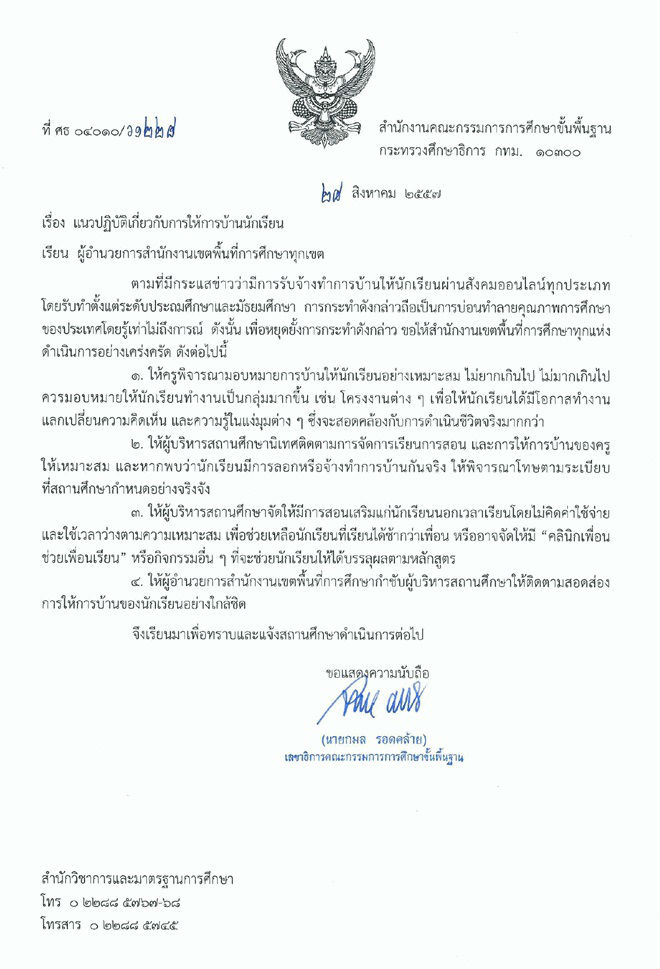 สพฐ.ตื่นแล้ว! ออกกฏบังคับทุก ร.ร. "ห้ามครูให้การบ้านมาก และยากเกินไป เน้นงานกลุ่ม ใครลอกถูกลงโทษ"