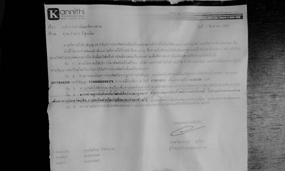 ตามที่คุยกับคนที่ติดต่อกลับมาจาก AIS จะเครียร์ให้และเรื่องก็คิดว่าจบไปแล้ว แล้วทำไมอยู่ดีๆ มีหนังสือจากบริษัทตัวแทนฟ้องร้องศาล ส่งมาที่บ้าน บอกว่าได้ยื่นฟ้องไปแล้ว มีขู่จะมาในเอกสารอีก จะเอายังไงกัน มาตอบหน่อย ตอนนี้เห็นแต่ใบน้า ของพ่อไม่รู้จะมีอีกหรือป่าว เซงมาก เครือข่ายเฮงซวย มีอยู่กี่เบอร์ จะย้ายหนีให้หมด เซงๆ เซงๆ