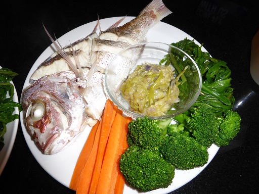 ครูท่านแรกเลย คุณสล่าปู่.....น้ำพริกหนุ่ม ปลานึ่ง ผักนึ่ง....ไม่มีปลาทับทิม มีแต่ปลาแสนปเปอร์ สีชมพูเหมือนกันน่าจะโอเค....ส่วนน้ำพริกหนุ่ม เจอแต่พริกตุรกี ยาวๆเขียวอ่อน ไม่เผ็ดเลยค่ะ แต่ก็ได้อยู่