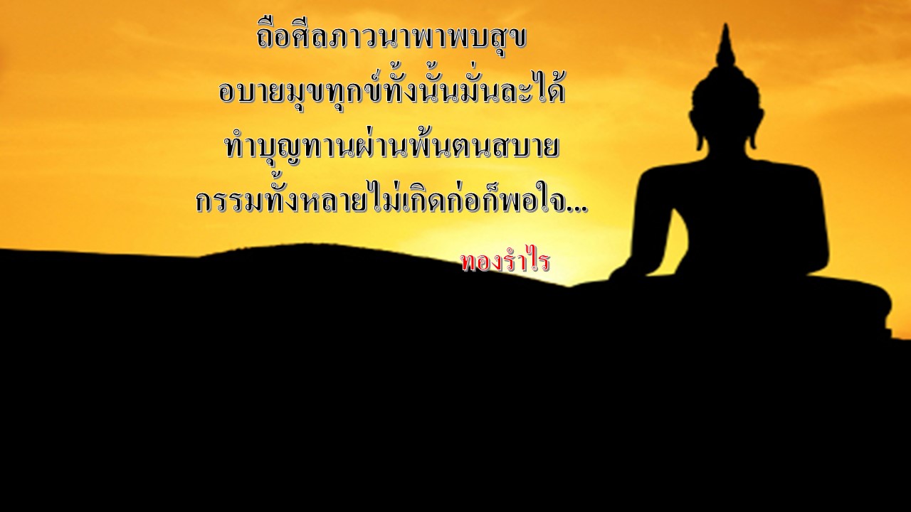 วันนี้ดี มีธรรม ประจำจิต วันพระคิด ใฝ่บุญ เกื้อกูลให้ ลดละเลิก เบิกบาน สำราญใจ อบายไกล ก่อกรรม ทำแต่ดี จิตใจจริง ยีงสงบ พบความสุข ผ่องใสสุก สกาว ราวสุขขี ฝักใฝ่ธรรม นำเนื่อง เรื่องราวดี ในธรรมนี้ มีด