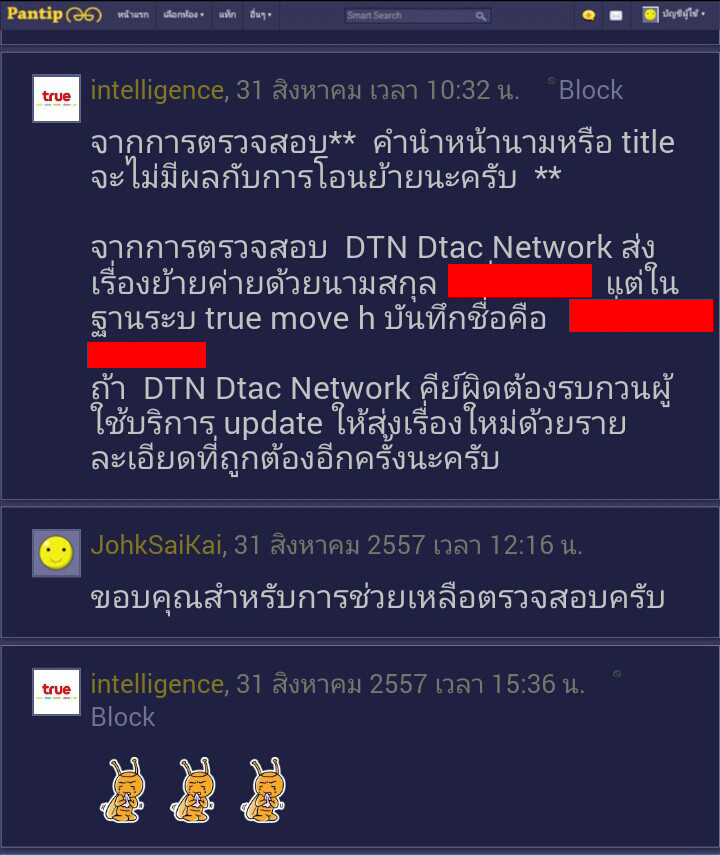 ส่งข้อความไปหลังไมค์ให้ตรวจสอบข้อมูลครับ!!! ย้ายค่ายตั้งแต่ 23 โดน Reject จาก True 4รอบ เพราะ DTN Dtac Network ส่งเรื่องย้ายค่ายด้วยนามสกุลที่ผิดคือ กลิ่มxxx จุดที่ผิดคือจาก น กลายเป็น ม ที่ถูกคือ