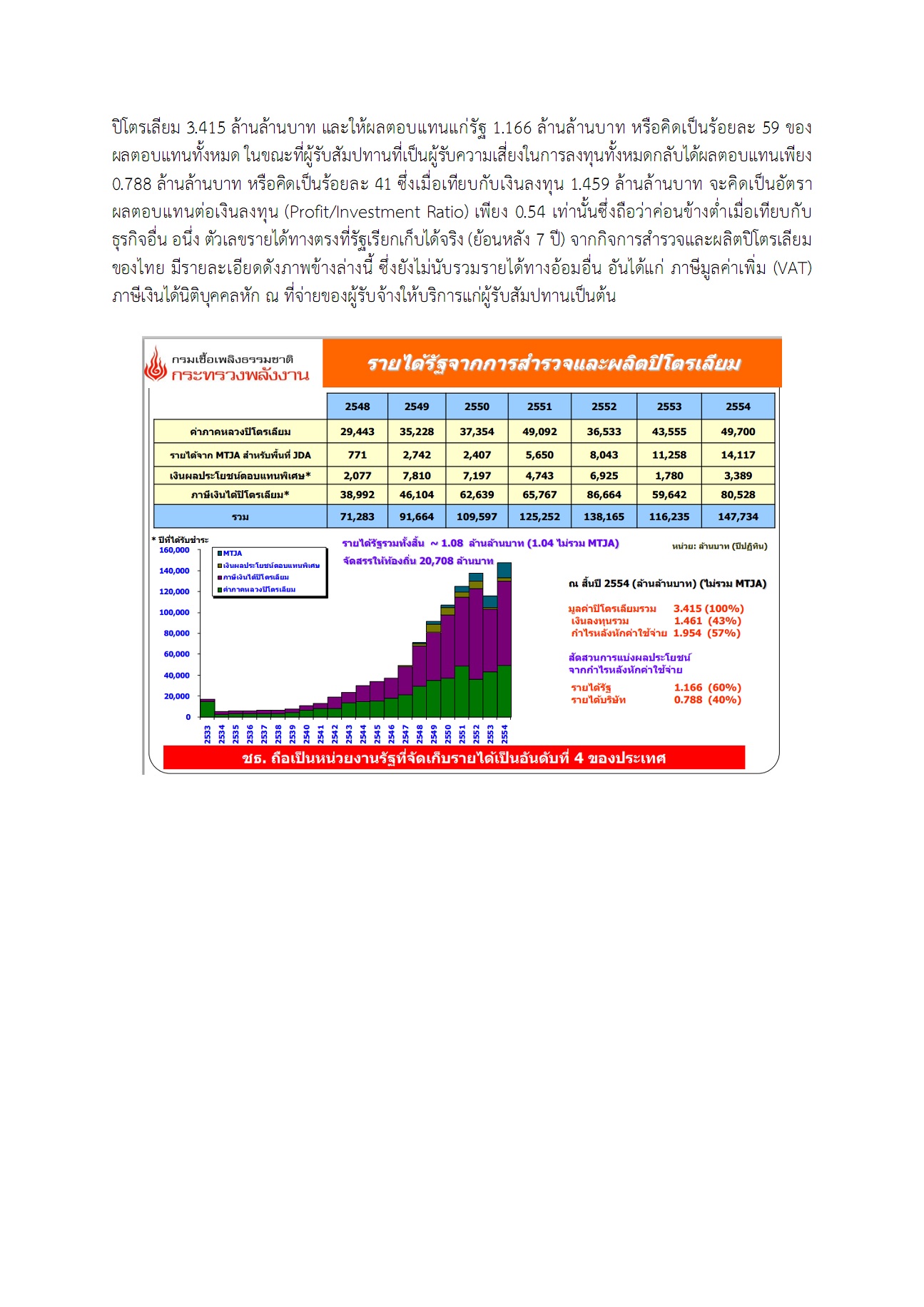 ข้อมูลจาก รายงานประจำปีกรมเชื้อเพลิงธรรมชาติ ปี 2554 : 40 ปี กฎหมายปิโตรเลียมไทย http://www.dmf.go.th/resources/annualReport/annual/th/PDF%20Ministry%202011%20th.pdf สำหรับท่านที่ต