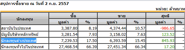 สรุปการซื้อขาย ณ วันที่ 2 ก.ย. 2557
