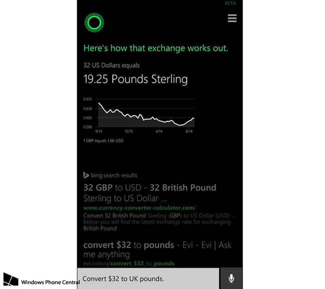 ด้วยฟีเจอร์ใหม่ที่กำลังจะมานี้ ผู้ใช้สามารถตรวจสอบเวลาต่างประเทศ หรือเปรียบเทียบมูลค่าเงินในสกุลต่างๆ ได้โดยไม่ต้องเปิดเครื่องมือค้นหา หรือใช้แอพอื่นเพื่อช่วยคำนวณอีกต่อไป เพียงพูดประโยคเพื่อถาม Cortana ก็จะได้รับคำตอบที่ต้องการ