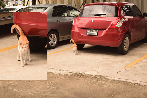 วันนี้ตอนเช้า น้องสะใภ้พาลูกไปเดินเล่นในที่จอดรถ ที่ลูกแมวอยู่
