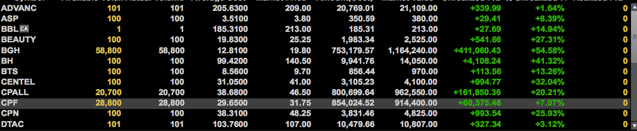 ตอนนี้ CPF ขาดทุน 10 เปอเซนกว่าแล้วครับ แล้วมีเยอะมากด้วย ถ้าจะถัวคงซื้อได้ทีละน้อยเดียวถ้าเทียบเป็นสัดส่วน PTT ขาดทุนประมาณ 3 เปอร์เซน ราคาแพงมากคงซื้อได้ทีละน้อยเดียวเหมือนกัน BTS ทุนผมต่ำอ่า แต่มีน