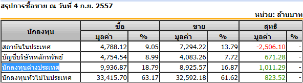 สรุปการซื้อขาย ณ วันที่ 4 ก.ย. 2557
