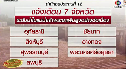 กรมชลประทาน แจ้งเตือน 7 จังหวัดแถบลุ่มแม่น้ำเจ้าพระยา คือ อุทัยธานี สิงห์บุรี สุพรรณบุรี ลพบุรี ชัยนาท อ่างทอง และพระนครศรีอยุธยา รับมือน้ำท่วม