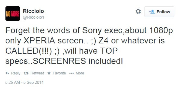 ทั้งนี้รายละเอียดดังกล่าวมาจากบล็อกเกอร์วงในของ Sony นามว่า @ricciolo1 ซึ่งออกมายืนยันว่า Sony Xperia Z4 รุ่นต่อไป (หรือจะใช้ชื่ออื่นอันนี้ยังไม่ทราบ) จะมาพร้อมกับสเปคระดับเรือธงจริงๆซึ่งก็รวมไปจนถึงความละเอียดของหน้าจอด้วย ซึ่งนั่นก็หมายความว่า Sony Xperia Z4 จะได้ใช้งานหน้าจอ 2K Quad HD ตามสมัยนิยม (ไม่ใช่ Full HD 1080p แบบใน Sony Xperia Z3) อย่างแน่นอน