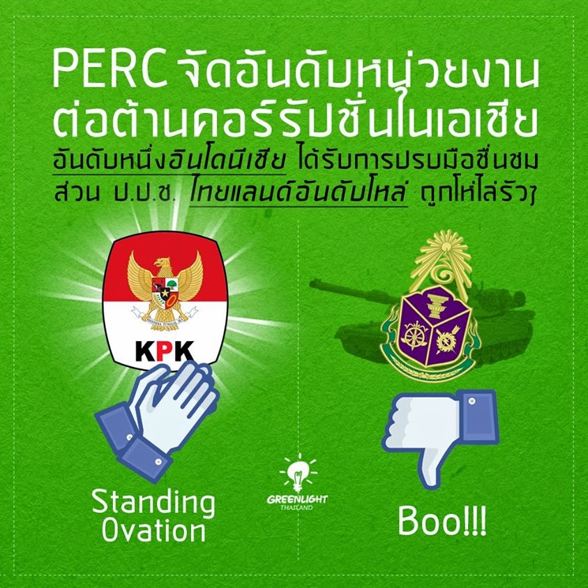 รายงานจัดอันดับองค์กรต่อต้านคอรัปชั่นในเอเชีย ฉบับล่าสุดของบริษัทที่ปรึกษา Political and Economic Risk Consultancy, Ltd. หรือ PERC ที่ตีพิมพ์ลงในจดหมายข่าว Asian Intelligence ฉบับล่าสุดเมื่อวันที่ 3 กันยายน 2557 มีการจัดอันดับให้คณะกรรมการป้องกันและปราบปรามการทุจริตแห่งชาติ (ป.ป.ช.) ของไทยอยู่อันดับสุดท้ายใน 12 องค์กรหลักในการต่อต้านคอรัปชั่นของประเทศในเอเชียที่ได้รับการประเมิน และตีพิมพ์ว่า “Boo” หรือโห่ไล่ ป.ป.ช.ในขณะที่ลุกขึ้นยืนและปรบมือ (Standing ovation) ให้กับคณะกรรมการกวาดล้างคอรัปชั่นของอินโดนีเซียที่ถือว่าได้คะแนนสูงสุดในกลุ่ม
