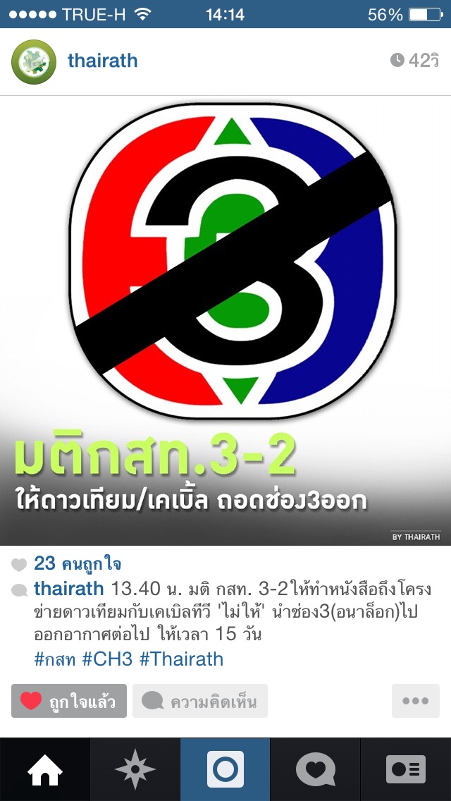 23 กันยายน 2557 ภายหลังการหารือร่วม ระหว่าง ช่อง 3 และ บอร์ด กสท.กสทช. จากผลคำสั่งทางปกครองของ กสท. ที่ให้โครงข่ายดาวเทียมและ เคเบิ้ลฯ ถอดผังช่อง 3 อะนาล็อค ออกจากโครงข่าย ทำให้ไม่สามารถชมช่อง 3 อะนา