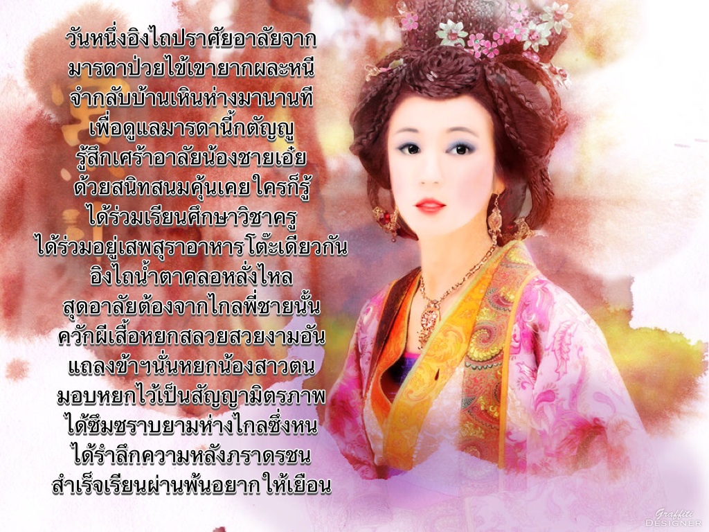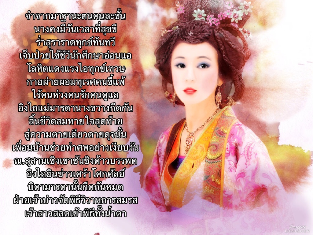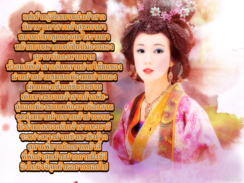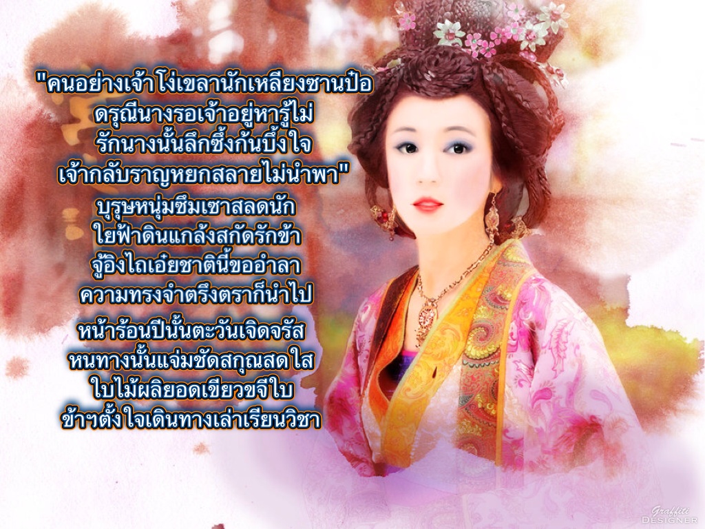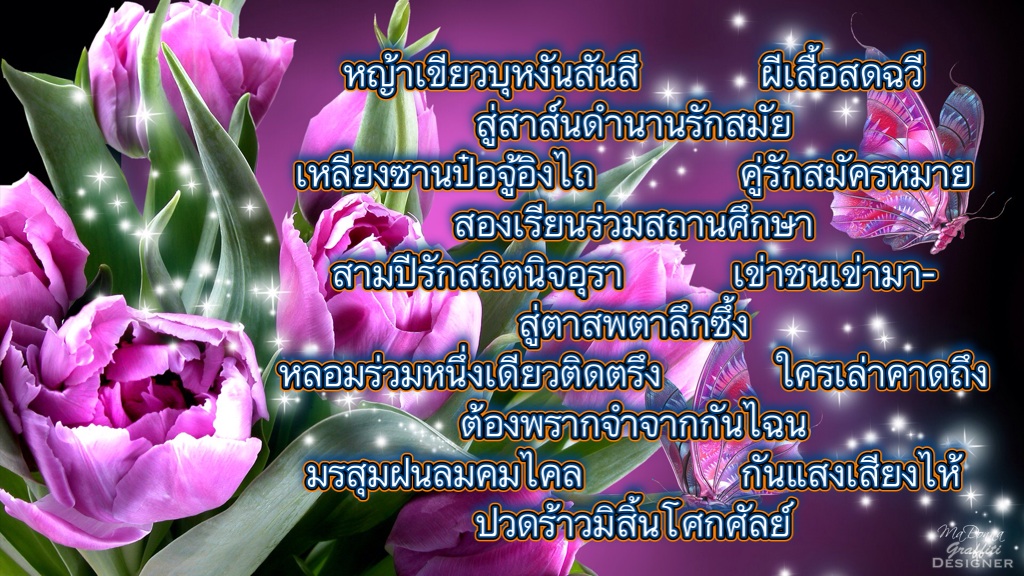 จะกล่าวถึงครูกวีสุนทรภู่ นำความรู้คู่วิชามามอบให้ ทั้งมีกลอนนานาฟังชื่นใจ ฉันอาศัยเรียนรู้ทุกคืนวัน กลอนสุนทรโวหารรื่นเริงจิต นำไปใช้ในชีวิตให้สุขสันต์ ทั้งนิราศอีกผีเสื้อนานาพรรณ กลอนท่านนั้นอยู่ในใ
