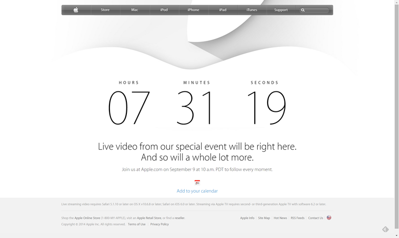 Apple ได้ทำการ redirect หน้าเว็บไซต์ Apple.com ไปที่ www.apple.com/live/ เพื่อเตรียมถ่ายทอดสดงานเปิดตัว iPhone 6 ในคืนนี้ โดยอาจจะมีเซอร์ไพรส์อีกด้วยสำหรับคนที่รอ iWatch เปิดตัวอย่างเป็นทางการเช่นกัน โดยหน้าเว็บไซต์นั้นจะมี countdown เวลางานอยู่ ซึ่งตามเวลาก็คือเที่ยงคืนบ้านเรานั่นเอง โดยสามารถเข้าไปเตรียมขนมนั่งรอดูได้ตาม link ด้านล่างนี้
