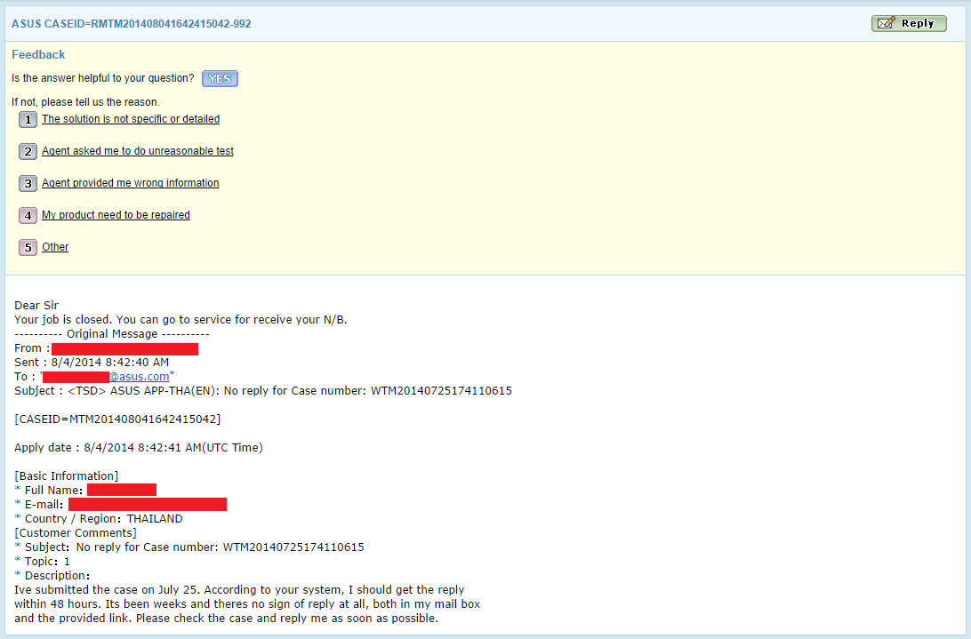 ๆแล้วค่ะ ทำไมรุ่นท็อปของ ASUS มันเป็นได้ขนาดนี้ ไม่ถึงครึ่งปี เปลี่ยนทั้งฮาร์ดดิสก์ ทั้งเมนบอร์ด (ถ้าเป็นคนก็คงเปรียบเหมือน ผ่าตัดเปลี่ยนหัวใจกับสมองใหม่) เราก็เลยส่งเรื่องร้องเรียนเข้าไปที่บริษัท ASUS ค่ะ -- จริงๆตั้งใจจะร้องเรียนบริษัทแม่ที่ต่างประเทศ (น่าจะไต้หวัน) เลย แต่ไม่มี e-mail ติดต่อแจ้งไว้ มีแค่ช่องให้กรอกสร้างเคสส่งเข้าไป เราก็กรอกรายละเอียดส่งเคสไปเรียบร้อย (เลขที่อ้างอิง WTM20140725174110615)