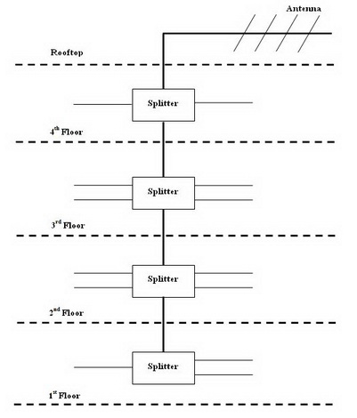 สวัสดีครับตอนนี้ผมมีปัญหาในการเดินสายอากาศสำหรับรับชมทีวีดิจิตอลนะครับ อยากจะรบกวนเพื่อนๆพี่ๆหน่อยครับ ที่บ้านผมเป็นอาคารพาณิชย์ 5 ชั้น (รวมดาดฟ้า) มีการเดินสายอากาศดังภาพครับ (สายจาก Splitter แต่ละจุดจะสั้นบ้างยาวบ้างๆไม่เท่ากันครับ แต่จะอยู่ในชั้นเดียวกัน)