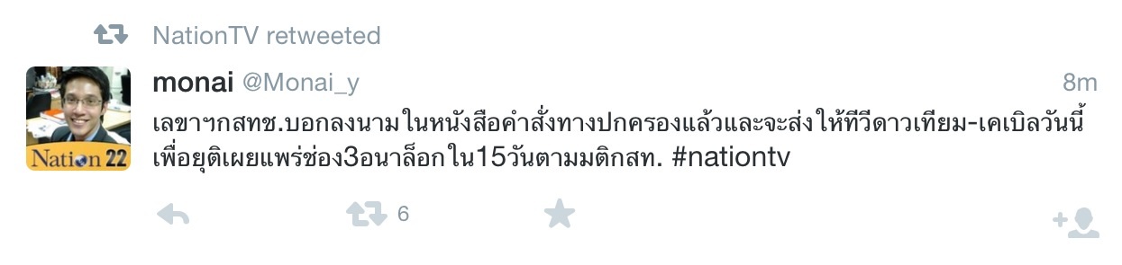 หวัดดีจ้ะ ขออนุญาตจ้ะ ตามนี้นะจ๊ะ ห้าม'ดาวเทียม-เคเบิ้ล'ออกช่อง3 กสท.ลงมติ3-2เสียงให้เวลา15วัน Source - เว็บไซต์แนวหน้า (Th) Monday, September 08, 2014 15:00 62733 XTHAI XECON V%NETNEWS P%WNN