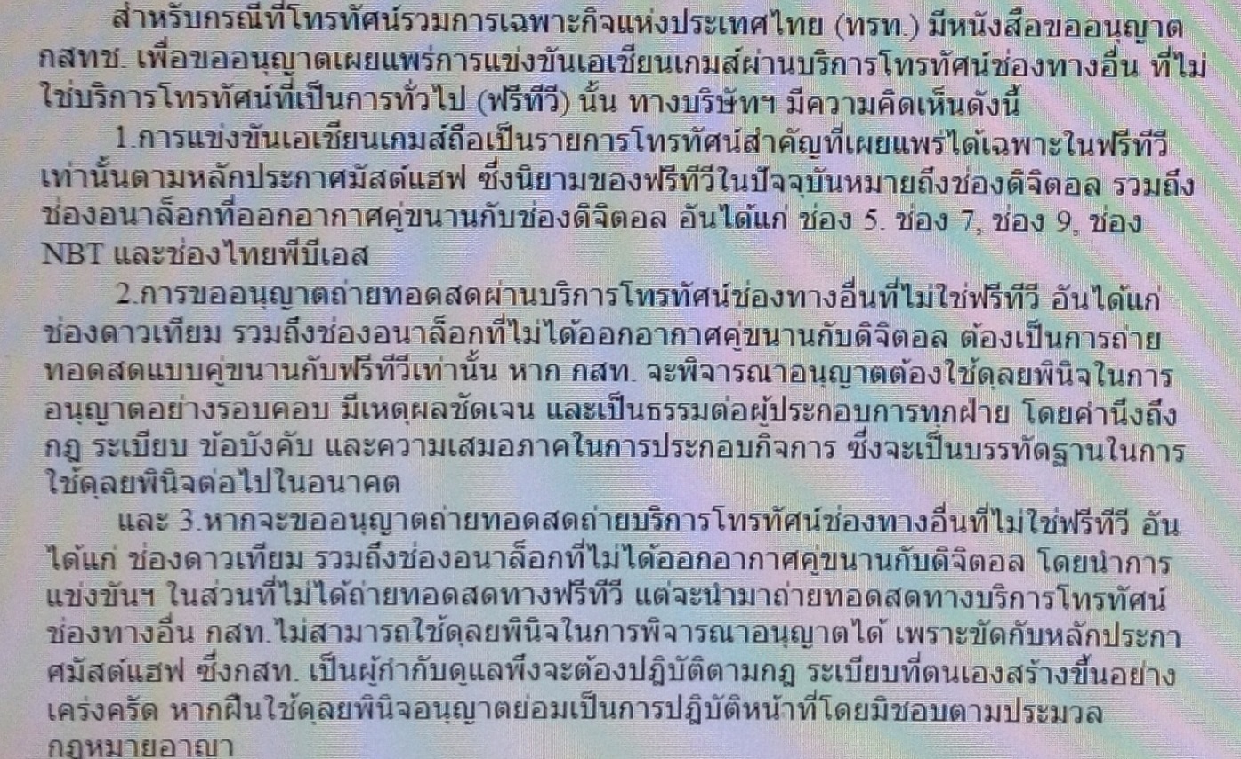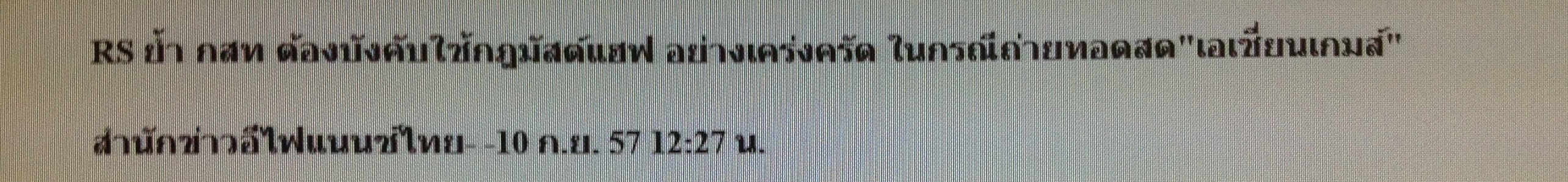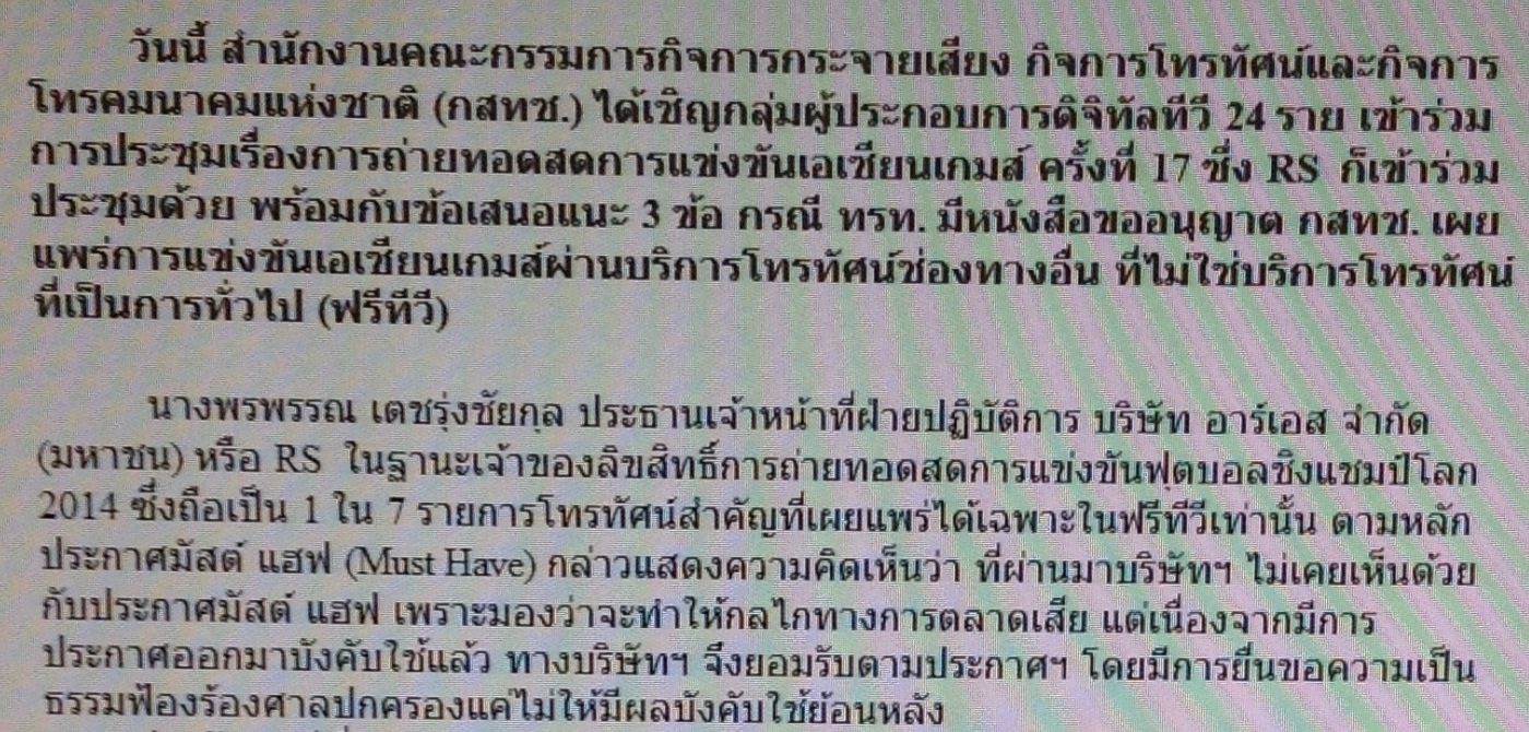 http://www.youtube.com/watch?v=Rt-IUqGq4gY&list=UUzMoibQRslh_1bTuW0YXc6A อาร์เอสฟ้องประธานกสท.ปฏิบัติหน้าที่มิชอบ ใช้กฎมัสต์แฮฟไม่เป็นธรรม เอื้อถ่ายทอดเอเชียนเกมส์ เมื่อวันที่ 1 ต.ค. ที่ผ่านมาเว