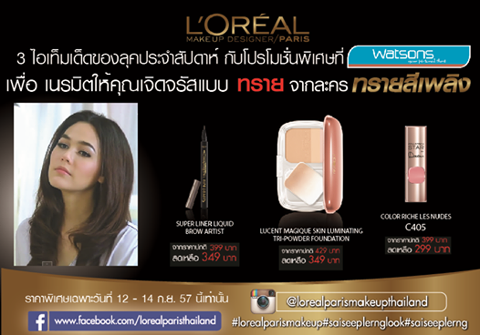 ความแรงของละคร "ทรายสีเพลิง" ทำให้ลอรีอัลประเทศไทย ฉกฉวยโอกาสนี้ จัดเซ็ตเครื่องสำอาง ที่ "ทราย" นางเอกในเรื่อง แต่งหน้าในโทนต่างๆ และนำลงในอินสตาแกรม เพื่อบอกว่าแต่ละลุค ของชมพู่ อารยา นักแสดงนำในเรื่อง แต่งด้วยเครื่องสำอางชิ้นใดบ้าง นอกจากลอรีอัลจะได้ประโยชน์แล้ว ช่อง 3 และตัวนักแสดงก็ได้ประโยชน์จากเรื่องนี้ด้วย