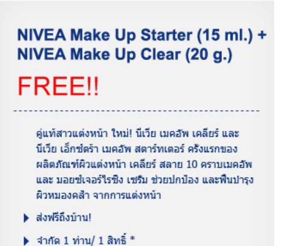 เราเห็น Line shop ส่งมาว่า Nivea แจก Nivea Make up starter และ Nivea Make up clear ฟรั เราเลยใส่ข้อมูลไป ( ตั้งแต่เดือนสิงหาคม ) โดย 1 คนมีสิทธิ์ได้รับ Nivea Make up starter ขนาด 15 กรัม และ Nivea Make up Clear ขนาด 20 กรัม ไปแบบฟรีๆเลย โดยทางนีเวียจะส่งให้ถึงบ้านภายใน 7-10 วัน เลยอยากทราบว่ามีเพื่อนๆคนไหนได้รับแล้วบ้างมั๊ยคะ