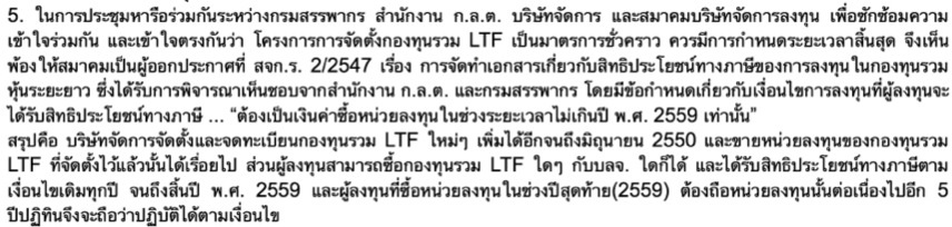 ตอนนี้ได้คำตอบชัดเจนจากเซียนกฎหมายภาษีรวมทั้งเจ้าหน้าที่สรรพากร Call Center ว่า ในเรื่อง LTF กฎกระทรวงที่ออกมาให้สิทธิลดหย่อนภาษีสำหรับการซื้อหน่วยลงทุน LTF นั้น ไม่มีกำหนดระยะเวลาสิ้นสุดการใช้สิทธิลดหย่อนไว้อย่างแน่นอน ฉะนั้น ไม่เกี่ยวกับกรมสรรพากรว่าจะต่อหรือไม่ต่ออายุ เพราะกฎหมายไม่ได้บอกว่ามีอายุและจะหมดอายุลงเมื่อไหร่ มีแต่บอกว่า ถ้าซื้อ LTF จากกองทุน LTF ที่จดทะเบียนกองทุนรวมหุ้นระยะยาวภายใน 30 มิ.ย. 50 ก็จะสามารถใช้สิทธิลดหย่อนได้ แต่ไม่มีระบุระยะเวลาสิ้นสุดไว้ด้วย