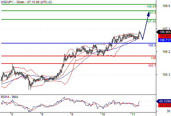 Our preference: Long positions above 106.5 with targets @ 107.45 & 107.8 in extension.
