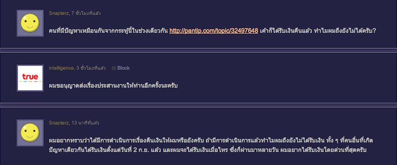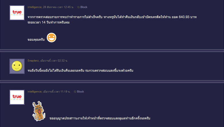 จนถึงตอนนี้ผมอยากทราบว่า ทางทรูได้ดำเนินการคืนเงินให้ผมหรือยัง? ถ้าคืนแล้วทำไมผมยังไม่ได้? และชี้แจงปัญหาล่าช้าที่เกิดขึ้นด้วย