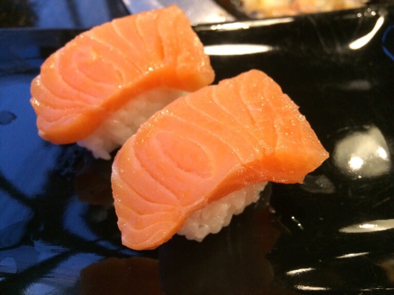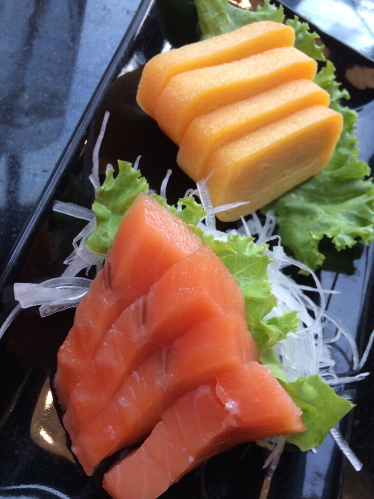 อันนี้เป็นซูชิปลาแซลม่อน,ซาชิมิ,ไข่หวาน
