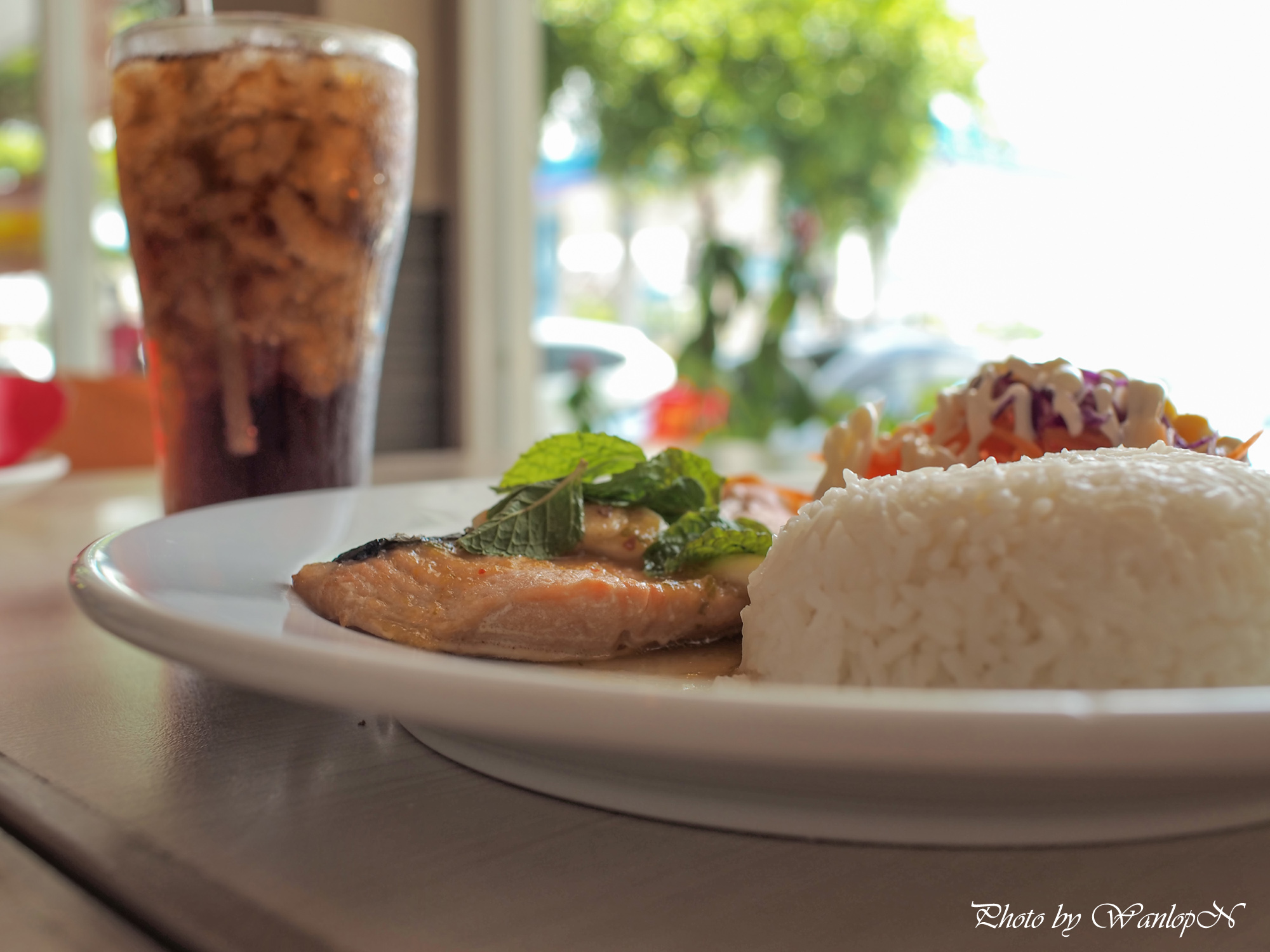 ใกล้บ้าน ไปเดินออกกำลังกาย แล้วกินข้าวใช้คนละครึ่ง ราคาสวัสดิการด้วยครับ เด็กนักเรียนมานั่งกันเยอะดี จ่ายชุดปลาแซลมอนไป 80 ปลาแซลมอนย่างอร่อยดี ซอสเทอริยากิหวาน ๆ มีซุปมิโซะกับเยลลี่แถมด้วยคร