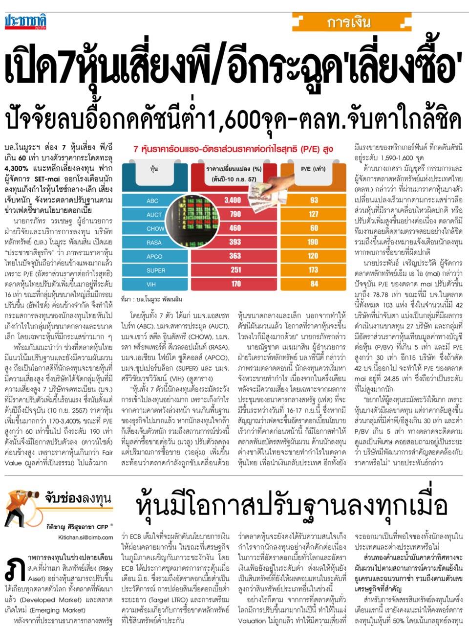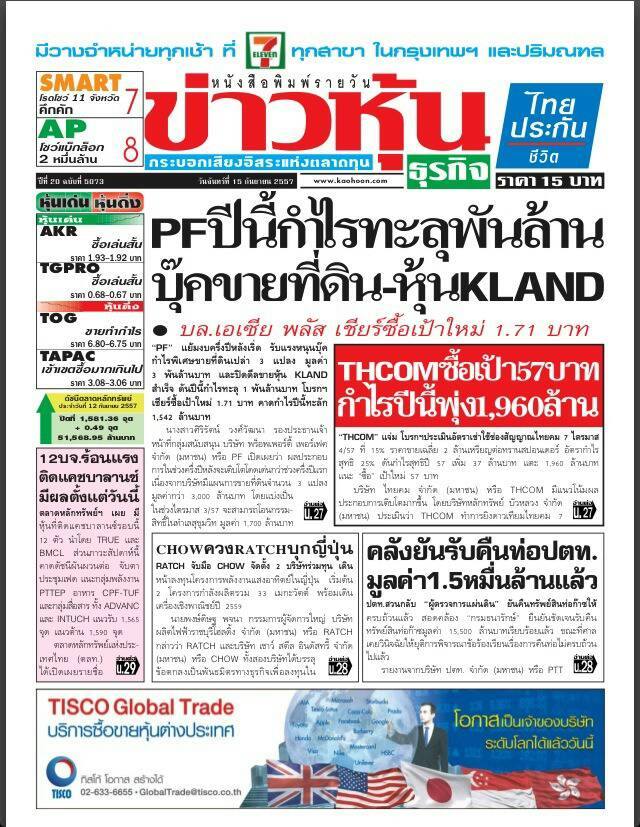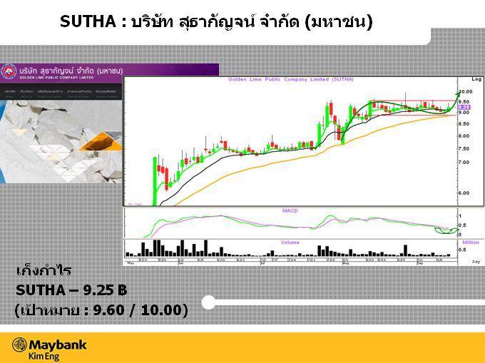TPIPL ปัจจัยบวก 1. ต่ำบุ๊คที่ปรับปรุงรายการที่ 19 บาท 2. 9 ต.ค. มีประชุมผู้ถือหุ้น เพื่อพิจารณา แตกพาร์ เป็น 1 บาท 3. มีแผนขยายกำลังการผลิตa. ปีนี้ ทยอยขึ้นกำลังการผลิตใหม่ของกระเบื้องหลังคาซีเมนต์ และ ผลิตภัณฑ์ทดแทนไม้b. ต้นปีหน้า กำลังการผลิตปูนซีเมนต์ 4.5 ล้านตัน เริ่มผลิต เร็วกว่าแผนเดิมที่วางไว้เป็นกลางปีหน้าc. กลางปีหน้า โรงไฟฟ้าใหม่กำลังการผลิต 90 เมกะวัตต์ จะเริ่มเดินเครื่อง จากปัจจุบันที่มี 45 เมกะวัตต์ แผนที่จะสร้างโรงงานไฟฟ้าเพิ่มเติม เป็น โรงงานไฟฟ้า ขยะ+ถ่านหิน 100 MW มูลค่าเงินลงทุนประมาณ 4.5-5 พันล้านบาท ซึ่งจะได้ Adder เพิ่มอีก 3.5 บาท 4. กำไรปีหน้าจะเติบโตโดดเด่น เป็น 2.1 พันล้านบาท จากปีนี้คาดไว้ 1.5 พันล้าน ทำให้ บุ๊ค adjusted ขยับขึ้นอีก 1 บาท เป็น 20 บาท ณ สิ้นปี558