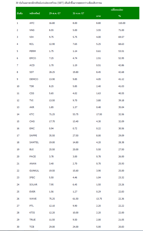 *** รายชื่อ หุ้น 30 ตัว ที่ปรับตัวขึ้นแรงมากที่สุดในเดือนสิงหาคม 2557