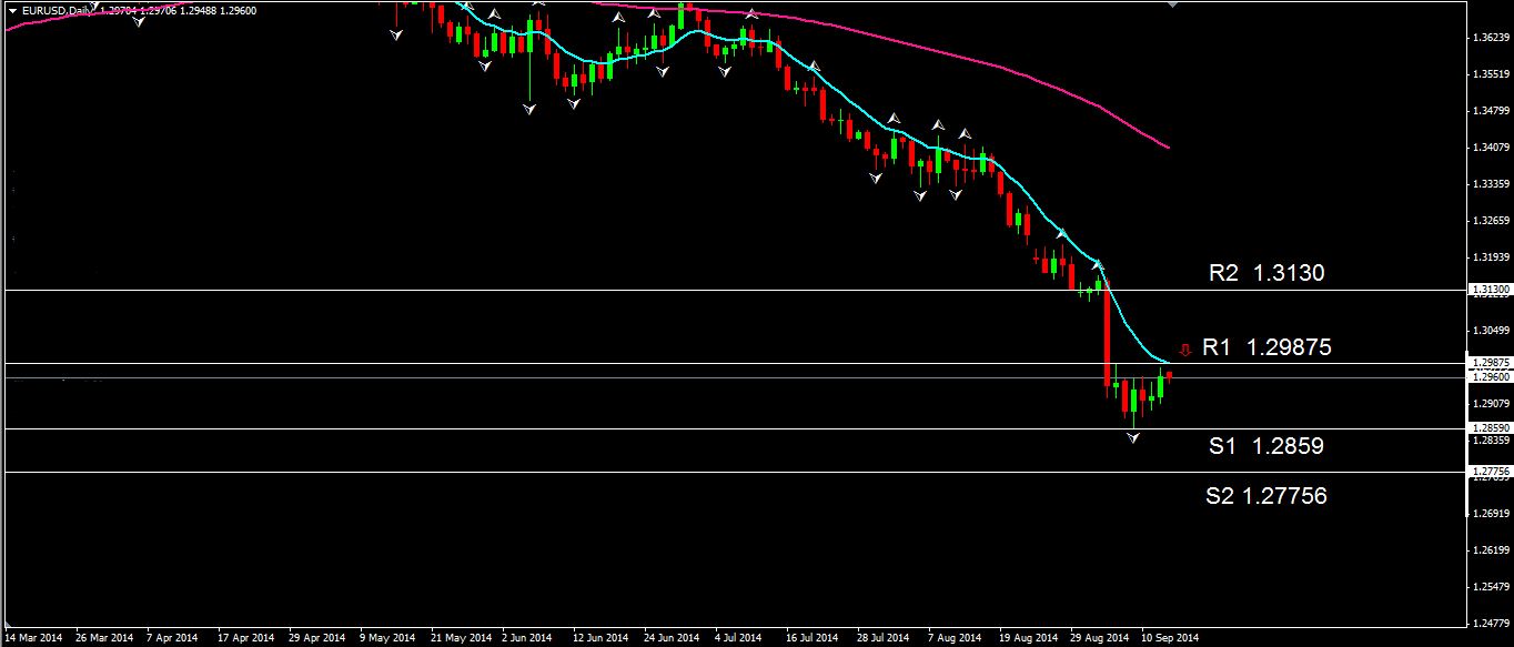จากราคาวันก่อนปิดเขียวและสามารถทะลุแนวต้าน 1.2957 ได้ แนวโน้มระยะสั้นวันนี้น่าจะขึ้นไปเทสแนวต้าน 1.29875 ถ้าผ่านไปได้จะมีแนวต้านอีกแถวๆ1.3127-1.3130 แต่ถ้าไม่ผ่าน 1.29875 ก็จะลงไปเทสแนวรับเดิม โดยตอนนี้เทรนใหญ่ยังเป็นขาลง http://www.moneywaveclub.com/mwc/index.php/forex-news-and-analysis/forex-analysis/177-eurusd-15-09-2014