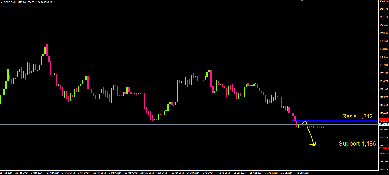 สำหรับ GOLD ตอนนี้ราคาหลุดแนวต้าน 1,242 ค่อนขชัดเจนแล้ว ก่อให้เกิด new low ซึ่งในระยะยาวแล้วทีมงาน money wave club ยังมองว่าสามารถลงต่อไปได้ถึง 1,186 หรืออาจจะลึกกว่านั้นครับ แต่หลังจากที่มีการ break แนวรับใหญ่ลงมา อาจส่งผลให้ราคาอาจจะขึ้นมาพักตัวบริเวณแนวต้านหรืออาจจะไซด์เวย์ก่อน ถึงจะลงต่ออีกครั้งครับ http://www.moneywaveclub.com/mwc/index.php/forex-news-and-analysis/forex-analysis/176-gold-analysis-15-09-2014