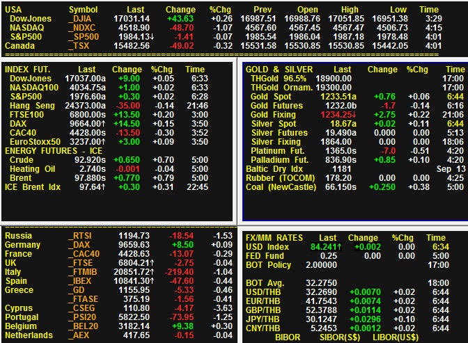 ดัชนีเฉลี่ยอุตสาหกรรมดาวโจนส์ปิดที่ 17,031.14 จุด เพิ่มขึ้น 43.63 จุด หรือ +0.26% ดัชนี S&P500 ปิดที่ 1,984.13 จุด ลดลง 1.41 จุด หรือ -0.07% ดัชนี NASDAQ ปิดที่ 4,518.90 จุด ลดลง 48.70 จุด หรือ -1.07%