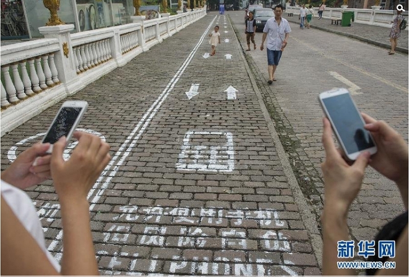 ฉงชิ่ง มหานครที่มีประชากรราว 28 ล้านคนในภาคตะวันตกเฉียงใต้ของจีน พบว่าตามทางเดินเท้าในเมือง ผู้สูงอายุและเด็กจำนวนมาก เดินไปในขณะที่ดูมือถือไปด้วย จนทำให้เกิดการชนกันโดยไม่จำเป็นอยู่บ่อยครั้ง ด้วยเหตุนี้จึงได้ตัดสินใจเริ่มทดสอบช่องทางเดินเท้าแยกสำหรับคนที่ใช้โทรฯมือถือ ซึ่งได้รับแรงบันดาลใจมาจากรายการโทรทัศน์ National Geographic ที่ได้มีการนำเสนอเลนบนทางเท้าแบบเดียวกันในกรุงวอชิงตันดีซี โดยทางเดินเท้าบางแห่งตามย่านบันเทิงในเมือง ได้มีการระบุสัญลักษณ์ไว้อย่างชัดเจนด้วยไอคอนรูปโทรฯมือถือและข้อความทั้งสองฝั่ง พร้อมทั้งมีป้ายเตือนอยู่เป็นระยะๆ