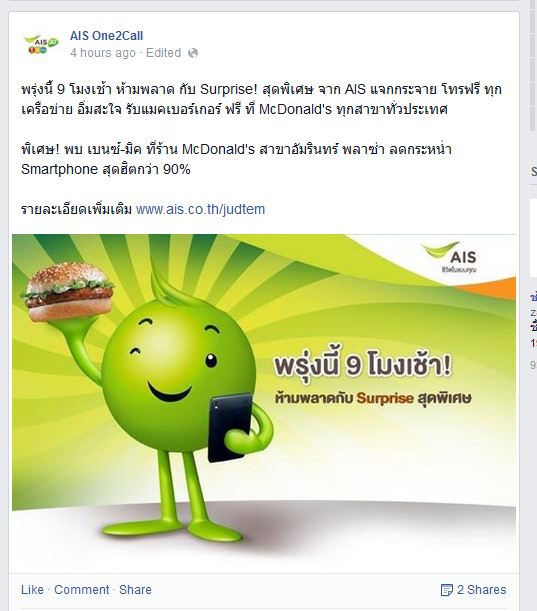 พรุ่งนี้ 9 โมงเช้า ห้ามพลาด กับ Surprise! สุดพิเศษ จาก AIS แจกกระจาย โทรฟรี ทุกเครือข่าย อิ่มสะใจ รับแมคเบอร์เกอร์ ฟรี ที่ McDonald's ทุกสาขาทั่วประเทศ พิเศษ! พบ เบนซ์-มิค ที่ร้าน McDonald's สาขาอัม