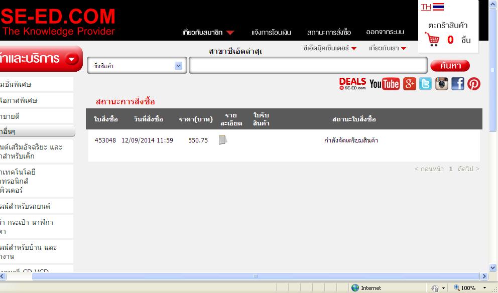 พอดีไปหาซื้อหนังสือจาก SE-ED หลายสาขาแล้วไม่มี พนักงานจึงจะนำให้สั่งซื้อออนไลน์ จึงทำการสั่งซื้อและจ่ายผ่าน 123 ซึ่งก็ได้ตัดเงินไปเรียบร้อยแล้วตั้งแต่วันที่ 12 ก.ย. แต่วันนี้ 16 ก.ย. เมื่อเช็ค สถานะ ก็ขึ้นเหมือนเดิมว่า กำลังจัดเตรียมสินค้า อุตสาห์ให้ส่งทาง EMS เสียเงินเพิ่ม 90 บาท โทรไปเบอร์ 02-7398753 ก็บอกว่าจะให้เจ้าหน้าที่โทรกลับ แล้วก็เงียบ ใครเคยเจอแบบนี้บ้างครับ หรือใครพอมีคำแนะนำอะไรดีๆบ้างครับ
