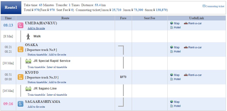 เดินทางจาก สถานี Umeda > Saga arashiyama 970 Yen