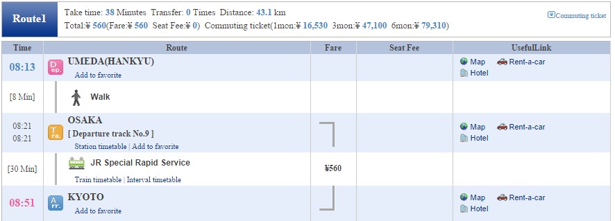 แต่ถ้าเสิชแยก คือจาก Umeda > Kyoto 560 yen