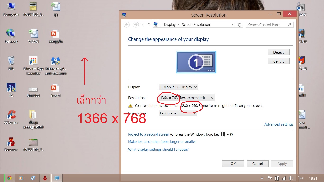 notebook Asus k46cb รุ่นนี้ ความละเอียดหน้าจอ ตามสเปคที่ระบุไว้ก็คือ 1366 x 768 แล้วผมก็เลือกความละเอียดหน้าจอตามแล้ว แต่ทำไม มันมีข้อความบอกว่า "ความละเอียดของคุณต่ำกว่า 1280 x 900 บางรายการอาจแ