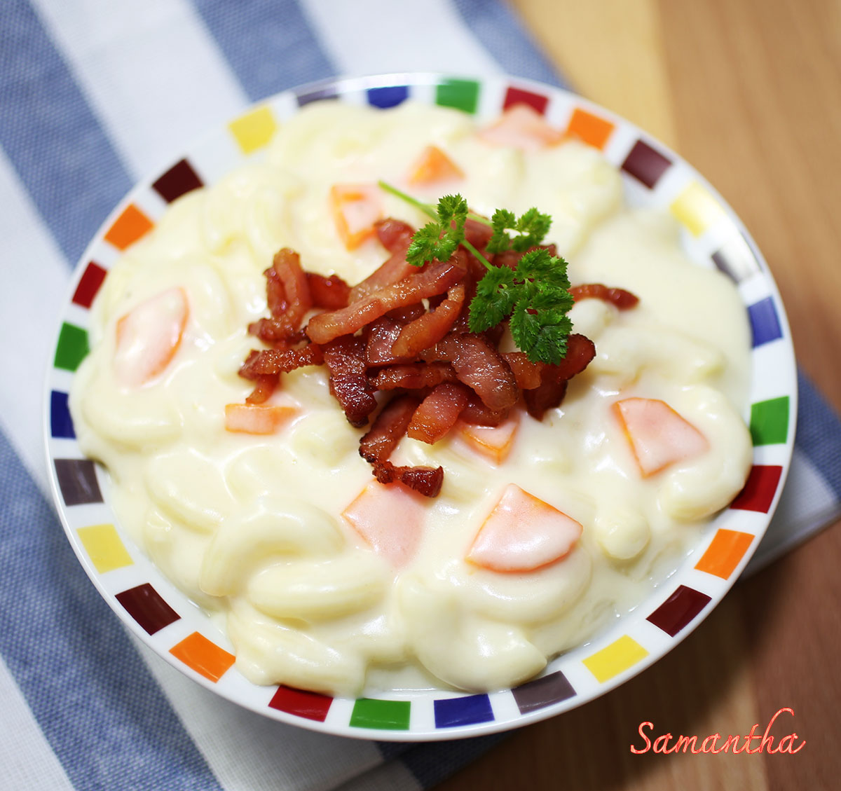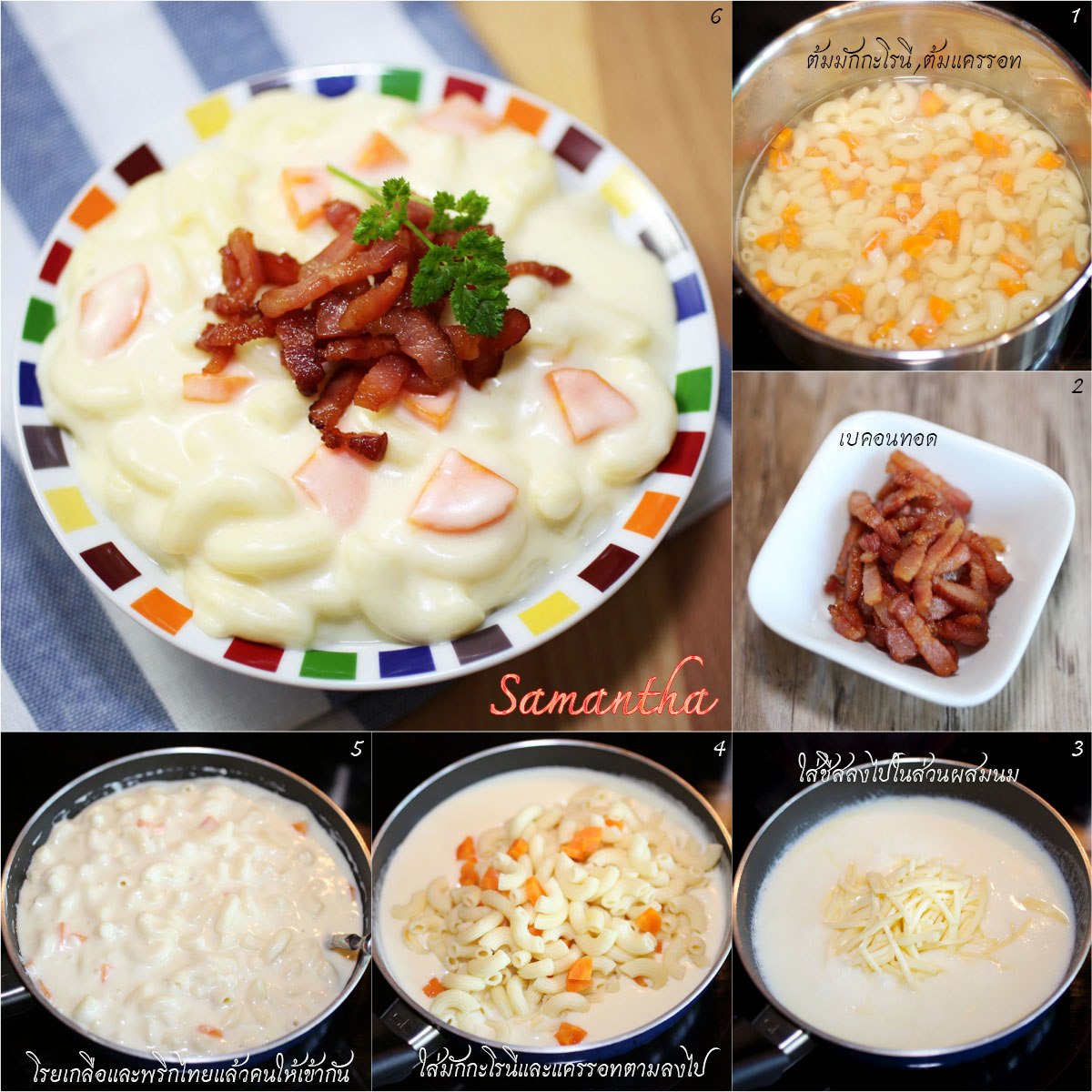 6.ปรุงรสด้วยเกลือทะเลยและพริกไทยดำป่น ชิมรสชาติตามต้องการ ตักมักกะโรนีชีสใส่จานหรือใส่ถ้วย โรยหน้าด้วยเบคอนทอด เสิร์ฟ