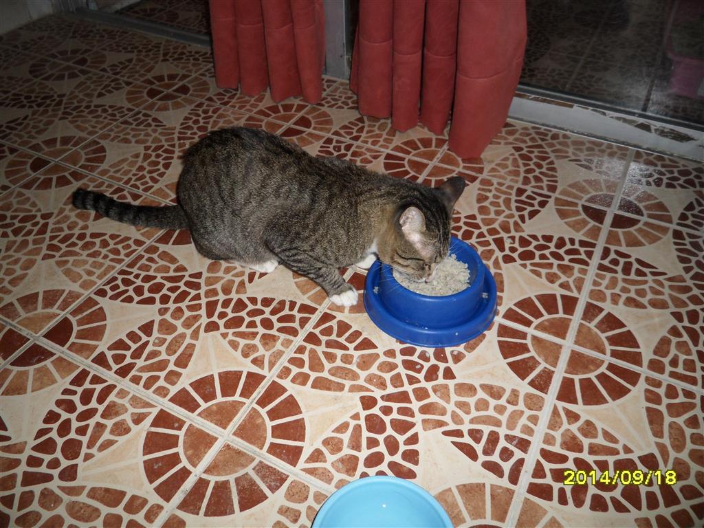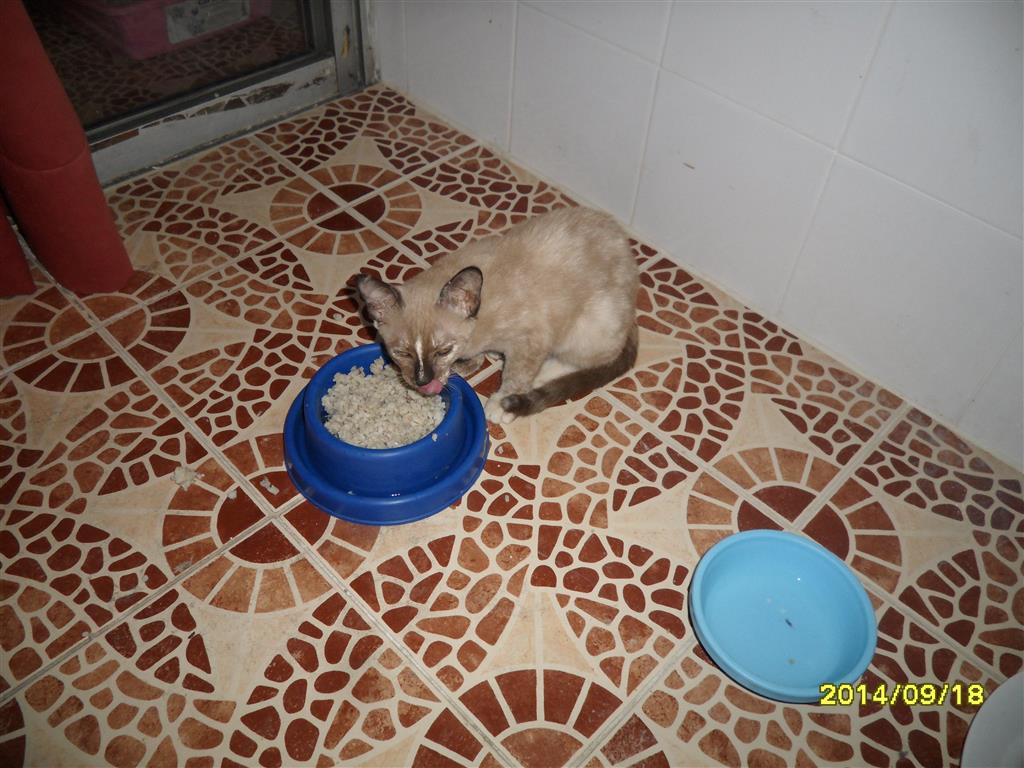 เค้าเป็นแมวจรจัดที่อยู่ใต้หอ คาดว่าน่าจะเป็นของนักศึกษาในหอนำมาปล่อยทิ้งไว้ เราเอาอาหารให้เค้ากินเป็นประจำ หลังจากนั้นเราก็ไม่เห็นเค้าเกือบอาทิตย์ เมื่อวานมาเจอเหมือนเค้าจะโดนกัด แต่เราไม่แน่ใจว่าโดนห