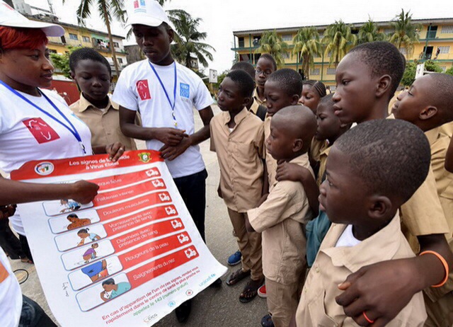 ประชาชนในโกตดิวัวร์ดัดแปลงถังน้ำแข็ง ด้วยการผสมสบู่ลงไป ให้ผู้อื่นเห็นความสำคัญของการรักษาสุขอนามัย เพื่อป้องกันการแพร่ระบาดของเชื้อไวรัสมรณะที่กำลังแผ่ขยายลุกลามในบรรดาประเทศเพื่อนบ้าน