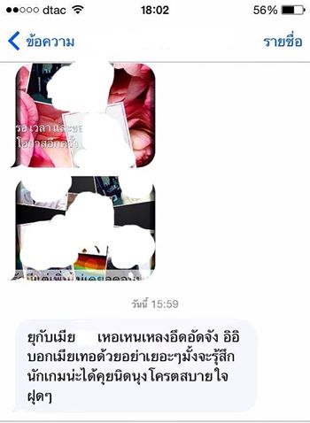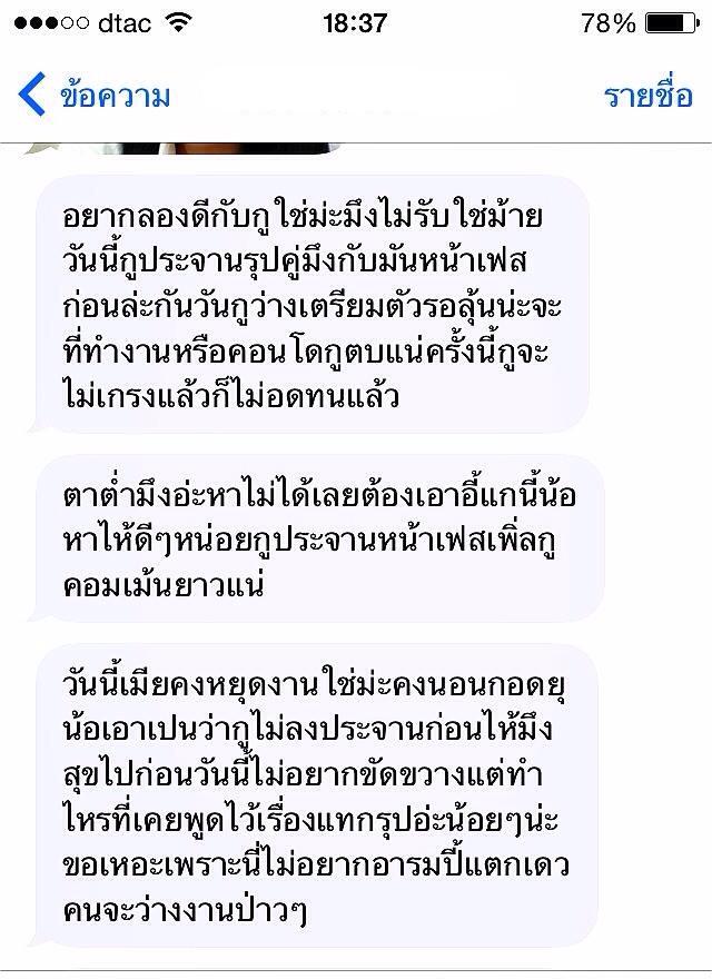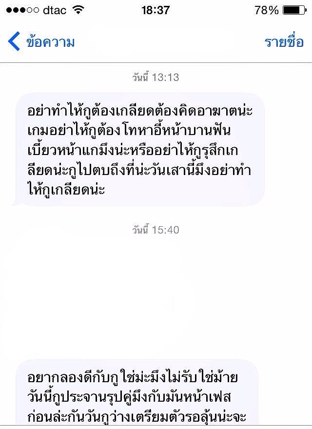 เช่น ส่งข้อความมาขู่ หรือโทรมาบ้าง แรกๆก็ไม่มีมีอะไรรุนแรงมาก เพื่อนเราก็นิ่งๆไม่ตอบโต้อะไร