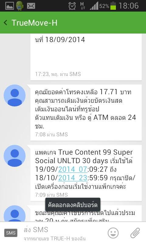 แต่เมื่อวาน ผมได้ไปธุระที่ รพ.ศิริราช ก็ได้เล่น face ฆ๋าเวลาไป ปรากฎว่า ก็จะมี sms บอกว่าผมใช้เน็ตไปเท่านั้นเท่านี้บาท ผมก็พยายามมองในแง่ดีว่าเมื่อวานมันวันสุดท้ายของ package เลยซื้อเติมใหม่ทั้ง package และเงินค่าโทร แต่ระบบแจ้งว่า package หมดเที่ยงคืน เติมไม่ได้อีก แต่เมื่อผมเล่น face/line ก็ยังมีการส่ง sms หักค่าโทรเป้นระยะ