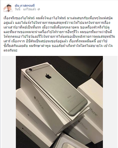 เราว่าน่าจะเกี่ยวกับที่ก่อนหน้าที่ คุณหนุ่ย พงศ์สุข นักจัดรายการ ที่คว่ำหวอดในวงการ IT ออกอาการดราม่า ว่า ถูกสกัด ที่จะเอา iphone 6 มาอวดในรายการเป็นที่แรกก่อนใคร