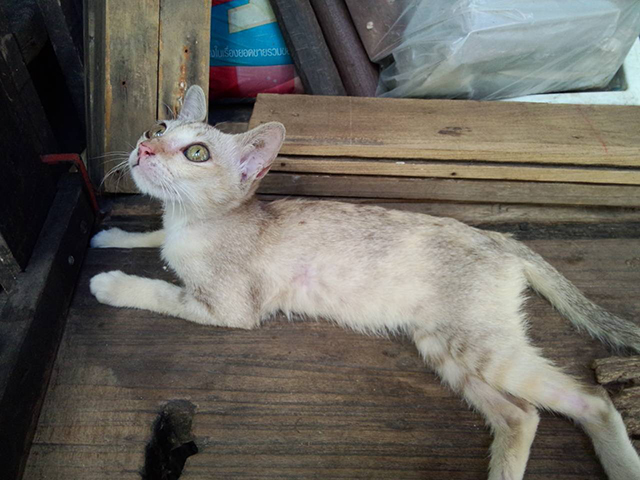 แมวตัวนี้ถูกไฟ คลอกมาค่ะ สังเกตรอยขนจะมีรอยไหม้ เรื่องมีอยู่ว่าเมื่อเย็นวันที่ 18 ม.ค. ลูกค้าหมอพร้อม เดินพาแมวของเขามาที่คลินิค ระหว่างทางเขาพบเจอลูกแมวน้อย 3 ตัว เขาได้เอาเรื่อง นี้มาบอกหมอ แล้วหมอ